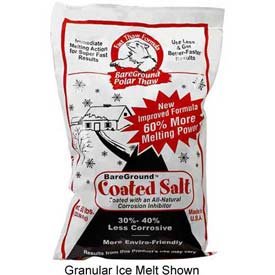 Bare Ground Coated Granular Ice Melt w/ CaCl Pellets - 50 Lb. Bag Bare Ground Ice Melt with CaCl Pellets is a blend of rock salt coated with Bare Ground liquid deicer, with a powerful calcium chloride ice melting pellet in the mix. This creates an ice melt that works quicker and 60% more effectively, while also being 40% less corrosive than standard rock salts. Non-staining. Continues to work down to -20F. 50 lb. bag.
